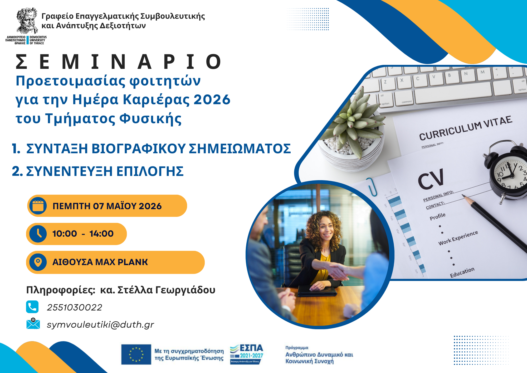 Writing a CV and Preparing for an Interview, by Ms. Stella Georgiadou (Career Counseling and Skills Development Office, DPTH), with the aim of preparing students who are interested in participating in the Department’s Career Day.